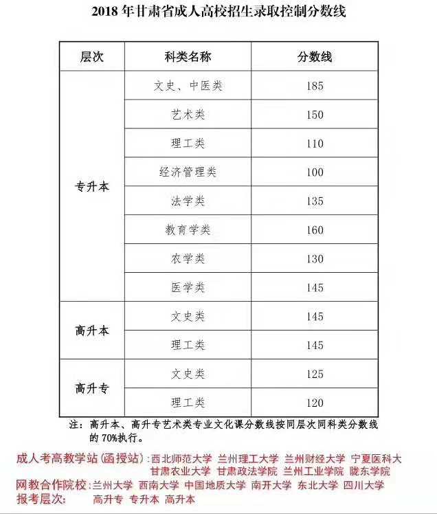 2018年甘肃省成人高校招生录取控制分数线