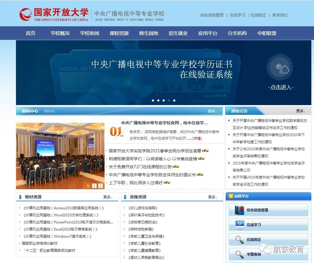 中央广播电视中等专业学校是一所经原国家教委批准、现由教育部职业教育与成人教育司领导并依托国家开放大学(原中央广播电视大学)设置的运用现代化教学手段和多媒体教学开展中等专业学历教育的开放性学校,其主要职责是负责全国电大系统中等职业教育的教学和教学管理方面的统筹协调、指导服务和评估监督,并面向社会直接招收初中毕业生和在职青年举办中等职业教育。学校具有颁发国民教育系列中等学历教育毕业证书的资格。