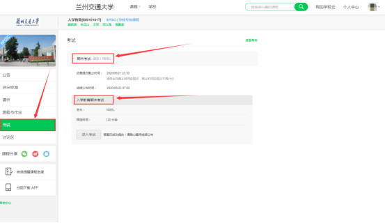 进入课程学习页面后,点击左侧栏的“考试”,即可参加当前开放的考试。一般老师会在公告中,提醒考试卷子发布的信息。注意:因为考试被系统默认成计分项,进入考试页面前,请仔细查看考试老师设置的相关信息。且一定注意是期末考试,非模拟自测。