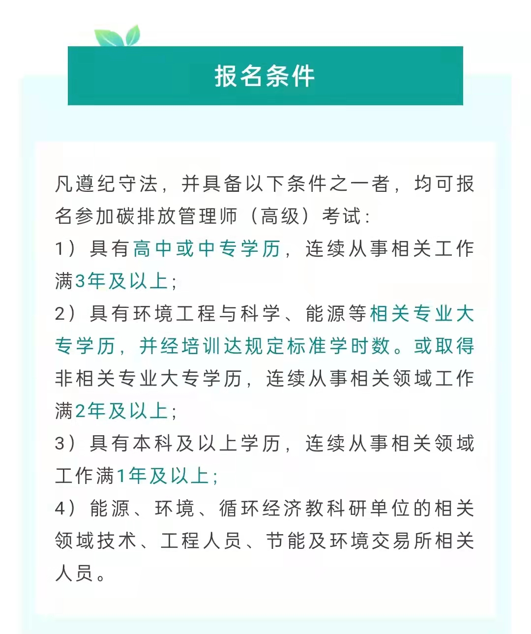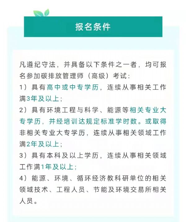 凡遵纪守法,并具备以下条件之一者,均可报名参加碳排放管理师(高级)考试: