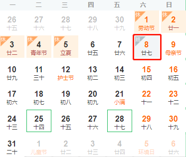 5月8日(星期六)正常上班,5月9日(星期日)全体休息。