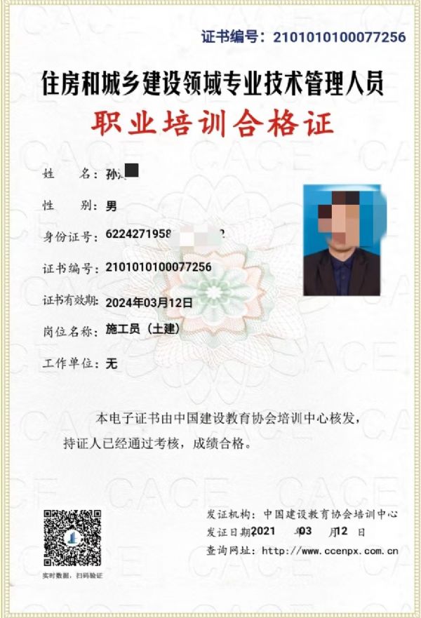 施工员证书考试通过后由中国建设教育协会颁发土建施工员证书,自2018年3月1日起,所有协会会员颁发的培训结业证书加盖会员单位(具有办学资质单位)印章和技术支持单位“中国建设教育协会培训中心”印章。其他样式证书均为伪造证书。原证书依然有效。中国建设教育协会审核成绩无误后一周内开始印发合格证书,成绩合格者将在1个月颁发证书。 土建施工员是建筑行业的基础岗位,其重要性毋庸质疑。该岗位有着广阔的就业前景。可以肯定地说,在未来几十年,土建施工员将在工程建设中大有作为。掌帆教育报考八大员证,土建施工员(土建和安装,其中安装分水暖和电气两个方向)、质量员、安全员(不包括专职安全生产管理人员)、标准员、材料员、机械员、资料员、劳务员),全国通用,网上查询,欢迎咨询合作。