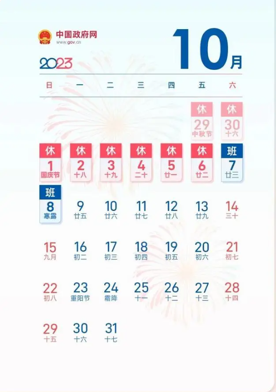 2023年9月29日(星期五)至10月6日(星期五)放假调休,共8天。10月7日(星期六)、10月8日(星期日)上班。提前预祝各位中秋、国庆双节快乐!阖家团圆!