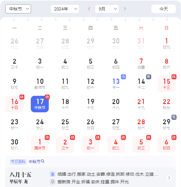 根据2024年《国务院办公厅关于2024年部分节假日的通知》,结合我集团整体情况,现将2024年中秋节放假通知如下: