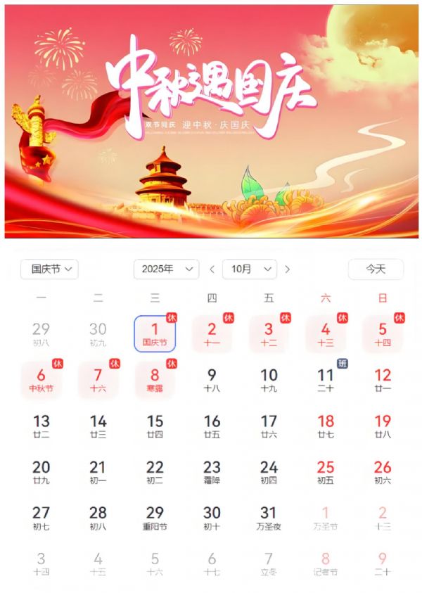 [10月1日-10月8日(放假调休),共八天。10月9日(星期四)正常上班。恭祝朋友们国庆中秋双节快乐、生活喜乐、阖家幸福!
